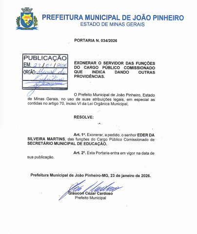 A Prefeitura de João Pinheiro publicou nesta sexta-feira (23) a portaria que oficializa a exoneração, a pedido, de Eder Silveira Martins do cargo de Secretário Municipal de Educação. A saída ocorre menos de 13 dias após outra mudança no primeiro escalão, o que volta a chamar atenção para a rotatividade de secretários na atual gestão.